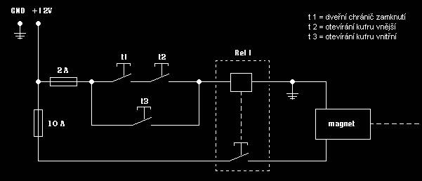 Je to úprava, která se nemusí vyrábět, dá se i koupit za cenu kolem 500 Kč, takže pro koho, kdo nemá doma spoustu součástek se vyplatí si to koupit. Jako lineární motor pro otevírání dveří nám poslouží cívka ze startéru (kterákoliv), já použil z nějaké škodovky, dále je zapotřebí jedno relátko, 3 spínače, 12m kabelu 0.35mm, pojistky 2A,10A a trpělivost. Celé to pak funguje tak, že auto, když je zamčené tak kufr nelze zvenčí otevřít, když se odemkne u řidiče, tak kufr lze otevřít ze zadu stiskem tlačítka na spodní straně plastu pod SPZ. Nouzové tlačítko pro otevření kufru je na palubové desce a funguje i když je auto zamčené. Cívku upněte přes plechovou pásku k zadním dveřím, tak aby dalo táhlo od kliky na dveřích až k pohyblivé části cívky. Aby cívka v plechu pořádně držela, dal jsem mezi ní a plech kus brusného plátna. | ||||||||||||||||||||||||||