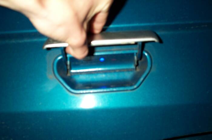 Kliky jsem velice jednoduše podsvítil tím, že jsem do plastového výřezu, který drží kliku, navrtal přesně doprostřed 5mm díru a použil jsem 5mm supersvítivou 3000mcd@20mA 3.3V LED diodu (možnosti nákupu u GM Elektronic nebo u GES Electronics) s 470ohm odporem -> úbytek napětí 9V (ještě lepší je dát 440ohm, 3cd leddioda svítí přesně tak jak má, vis Ohmův zákon). LED je namířena na kliku a pomocí odrazu je vidět na plastovém výřezu -> rovnoměrnější vodorovné osvětlení kliky.
